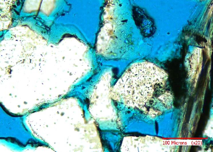 The primary tool of thin section petrography is point counting: the rock is described in great detail at a large number of (representative or random) points and statistical techniques used to analyse the resultant information. As can be seen from the above image, what we think of as a rock at the visible scale is a highly heterogeneous mixture of particles, interstitial clays and cements, and pore spaces. Their relative composition, structure, inter-relationships and history are all important in determining how the rock will behave. What information is important will vary depending on the application: a sample of concrete taken from a built structure will be examined to determine the likelihood of catastrophic failure whereas an oil-bearing rock is f interest for the amount of oil it contains (porosity and saturation) and the ease with which the oil can be extracted (permeability).